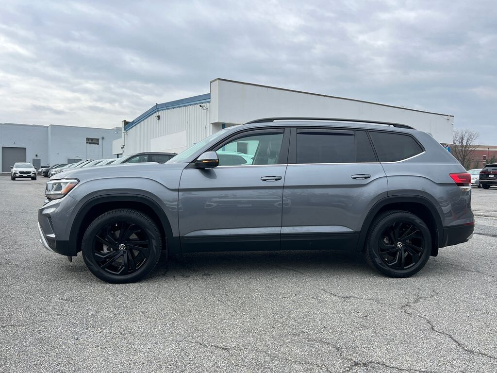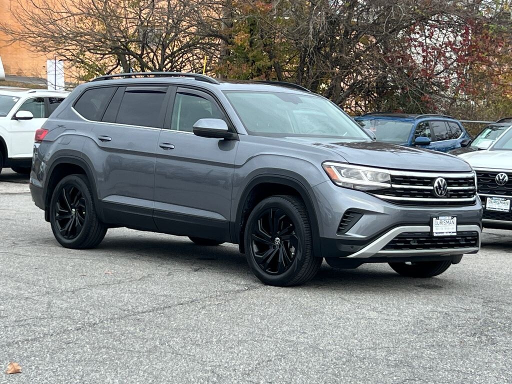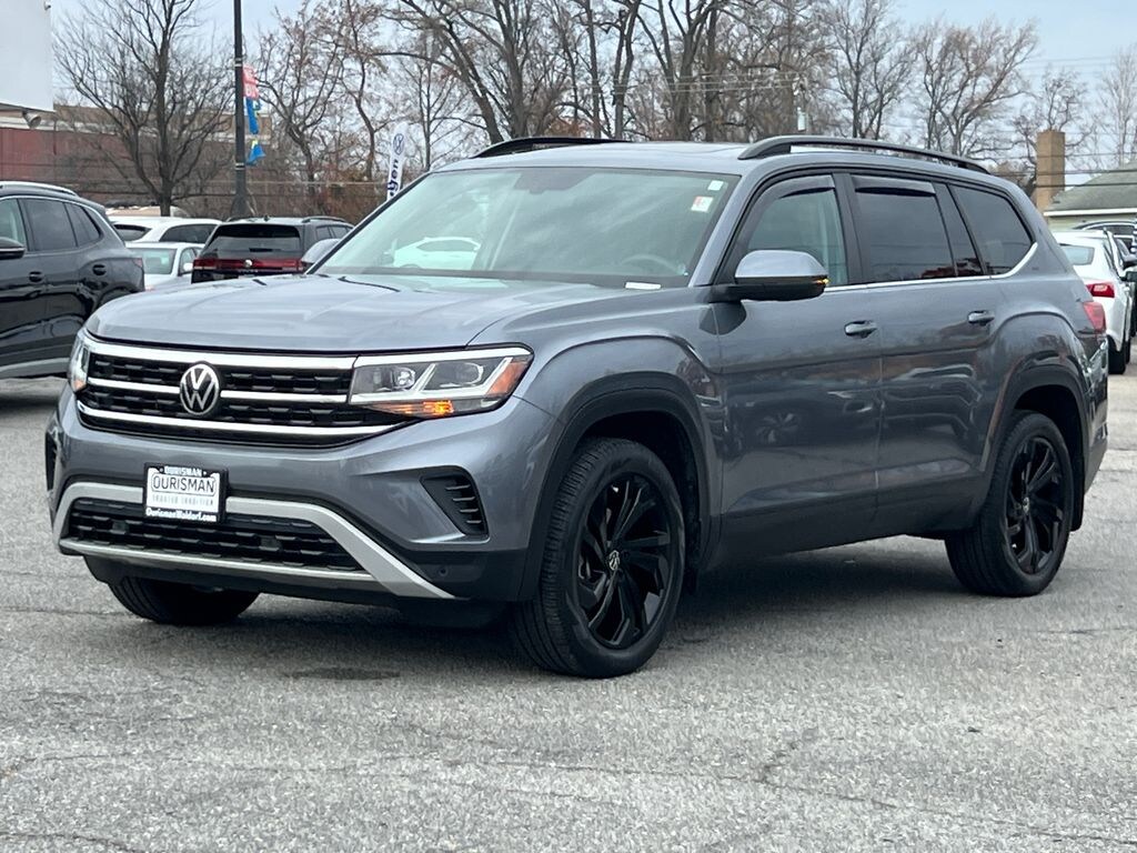 2022 Volkswagen Atlas 2.0T SE w/Technology Platinum Gray Metallic Maryland State Inspected with over 120 point inspection performed by a trained technician., 3RD ROW SEATING, Black Wheel Package, Exterior Parking Camera Rear, First Aid Kit, Heated Comfort Front Bucket Seats, Heated door mirrors, HEATED FRONT BUCKET SEATS, MEMORY POWER DRIVER SEAT, Outside temperature display, Panoramic Sunroof Package, Perforated V-Tex Leatherette Seating Surfaces, Power door mirrors, POWER LIFT GATE, Power steering, Power Tilting & Sliding Panoramic Sunroof, Power windows, Privacy Cover (DISC), RAIN SENSING WIPERS, REMOTE KEYLESS ENTRY, Roadside Assistance Kit (DISC), Rubber Mats Kit - Bench Seats (DISC), Security system, Steering wheel mounted audio controls, Tilt steering wheel, Trunk Liner w/VW CarGo Blocks, Turn signal indicator mirrors, Wheels: 20" x 8J 5-Spoke Black Painted Alloy. CARFAX One-Owner. Clean CARFAX. Certified. Volkswagen Certified Pre-Owned Details: